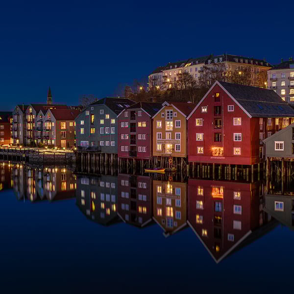 Trondheim, Norway. Colorful timber houses and Nidelva river in the old town district